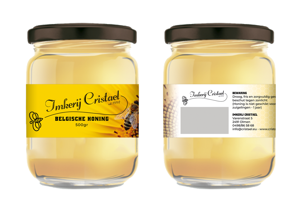 Voor Imkerij Cristael hebben wij een etiket ontworpen dat warmte, ambacht en natuurlijke puurheid uitstraalt. De basis van het ontwerp is een palet van zachte, gele tinten die niet alleen verwijzen naar de kleur van honing, maar ook een gevoel van zonlicht en levendigheid oproepen. Deze gele kleuren zorgen voor een frisse, uitnodigende uitstraling die meteen opvalt in het schap, terwijl ze tegelijkertijd perfect passen bij de natuurlijke herkomst van het product.