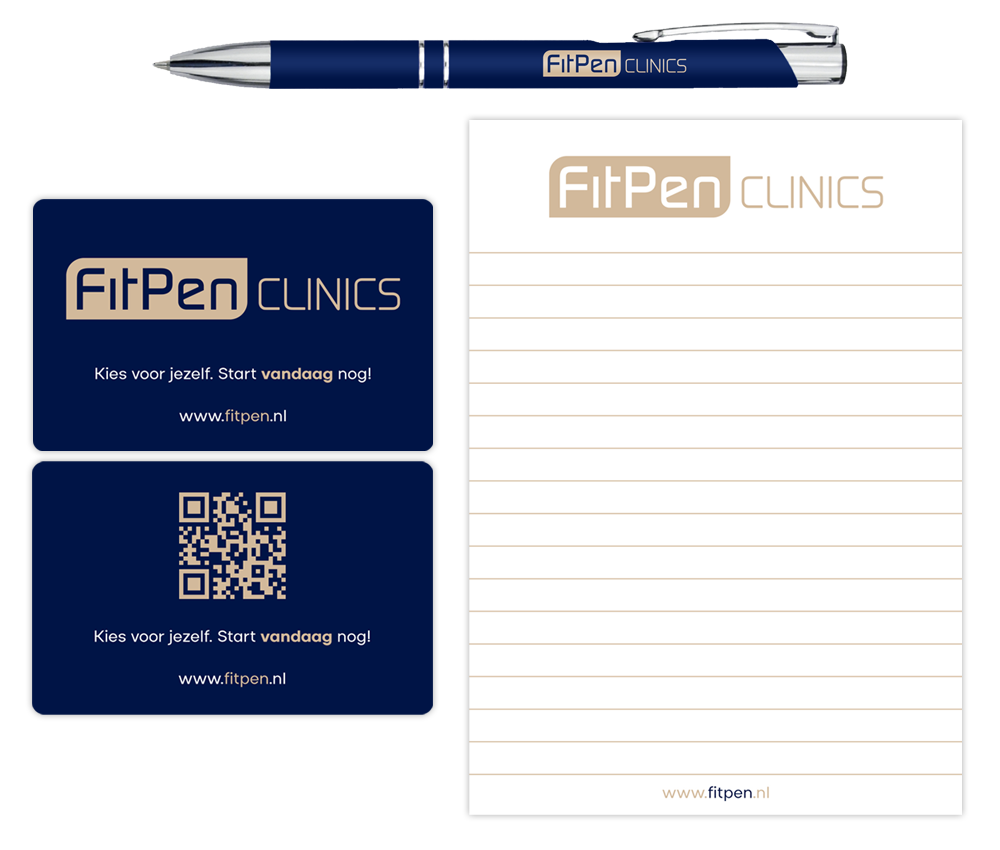 Voor FitPen Clinics hebben we het nieuwe logo mogen ontwerpen en als vervolgopdracht is ons gevraagd om ook een ontwerp te maken voor een notitieblok, PVC pasje en een pen met bedrukking. Alle ontwerpen moesten een luxe uitstraling krijgen en een passend geheel vormen.