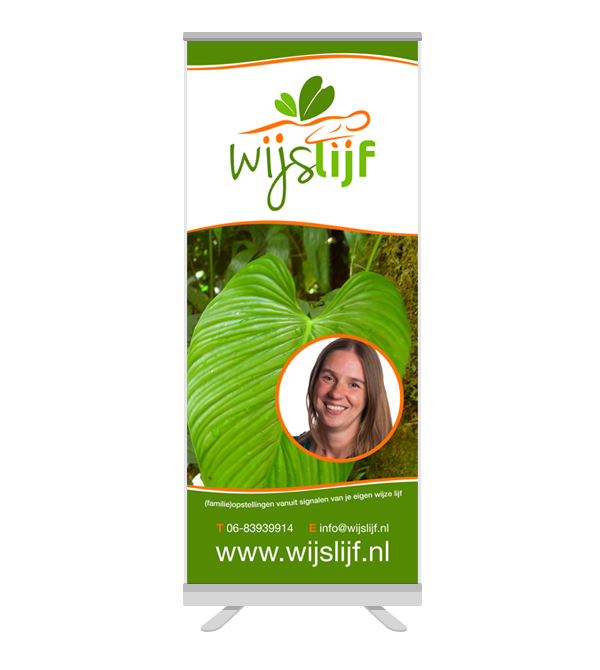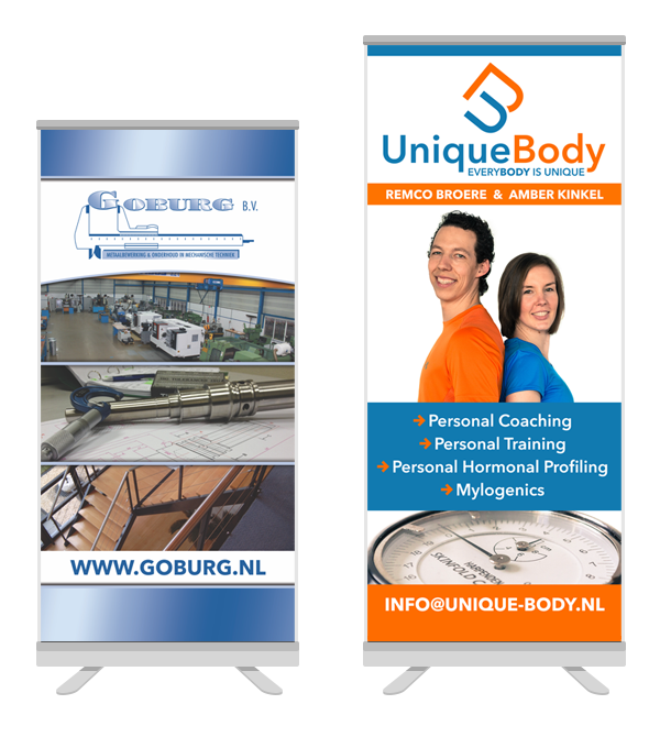 De roll-up banner is ideaal om mee te nemen naar evenementen, beurzen en presentaties. De banner rolt op in de cassette en is hiermee zeer mobiel en veelzijdig inzetbaar. Wij maken een passend ontwerp voor dit onmisbaar stukje reclame!