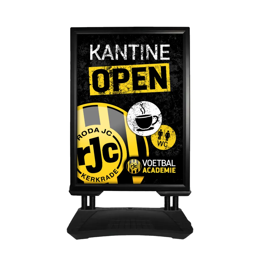 Voor de Roda JC Voetbalacademie in Kerkrade hebben we een nieuw ontwerp gemaakt voor het stoepbord buiten de kantine. Het oude bord toonde een treurig wit A4tje met de tekst ‘Kantine Open’. Dat kon uiteraard beter, maar aangezien er een grootse nieuwbouw voor de academie zit aan te komen, worden investering in het huidige en verouderde complex tot een minimum beperkt. Kleine dingen maken soms een grote indruk en onder het mom van ‘Sfeer is beleving’, aan ons toch de eer om hier iets moois van te maken. Het ontwerp inclusief de bedrukking van de waterafstotende A1 formaat posters hebben we snel kunnen realiseren.
